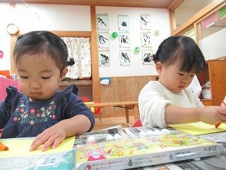 もうすぐ節分。今日は升作りをしました。少しずつ升のパーツを作っていましたが、今日は鬼の顔にマジックで口を書きました。小さいおちょぼ口や、大きな口、にりましたこっと笑った可愛い口など様々な鬼の升ができあがりました。その後は車やブロック、パズルなどで遊びました。