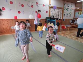 今日は牛乳パックを使って鬼の升を作りました。好きな色の升を選んで丸シールで目玉を付けました。鬼の髪の毛は好きな色の花紙を選んで丸めてくっつけました。かわいい鬼の升が出来上がりました。2月に使いたいと思います。その後は、ホールにてお正月遊びを楽しみました。以前作った羽子板と風船を使って羽根つきをしました。上手に風船をはじいて楽しんだり、なかなかうまく風船を打てず風船を追いかけて楽しみました。