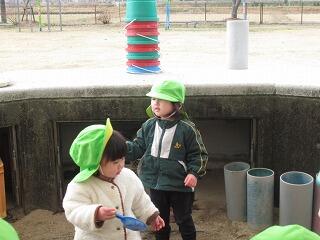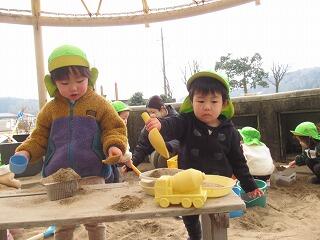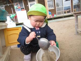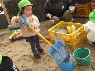 今日は久しぶりに砂遊びをしました。園庭でくじら山に登ったり、滑り台で遊んでいましたが、風が冷たかったので、砂場でみんなでじっくり楽しみました。料理をしたり、穴を掘って道路を作って、車の玩具を走らせたり、同年代の子同士でやり取りを楽しみながら、食べる真似をしたり、たくさんごちそうを作って保育者に「どうぞ、めしあがれ♪」と持ってきてくれました。「これはなにかな?」と尋ねると、「アイスクリームです」と小さいバケツ山盛りのアイスクリームを作ってくれました。『あたたかいものはありますか?』と尋ねると、しばらく考え込んでから、「はいどうぞ♪カレーライスです」と持ってきてくれました。自分の大好きなメニューなのかなと思いながら食べる真似をすると満足そうにお皿を引き取っていました。