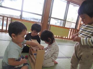 今日は身体測定の後、お部屋でパズルやカースロープで遊びました。車が大好きな子たちは集まって始終順番にカースロープで玉や車の玩具を転がして楽しんでいました。パズル遊びでは、絵合わせのパズルやはらぺこあおむしのパズルなどがありましたが、同年代の子と協力して完成させたり、パズルを積み上げて楽しむ子もいました。高くパズルを積み上げて「みてみて~」と見せてくれました。