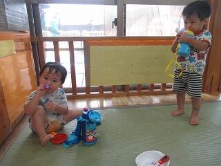 今日は水遊びをした後、室内でみんなでお茶を見ました。何組か集まって子ども同士顔を見合わせて団らんしながらお茶を飲みました。皆で飲むとおいしいのか、水筒の半分くらい飲む子もいました。