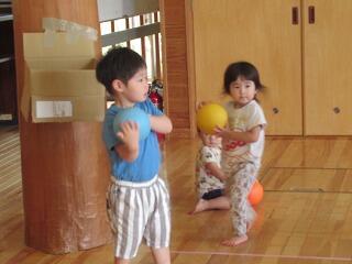 今日はホールでボール遊びをしました。久しぶりのホールは広々としてました。「よーいどん」の掛け声で走り出す子ども達。ボール内をグルグル回ってはしってました。ボールも出してみると、両手でポーンと投げたり、段ボールのゴールを作ると、そこに入れてました。入れるのがとても上手なみかん組さんでした。