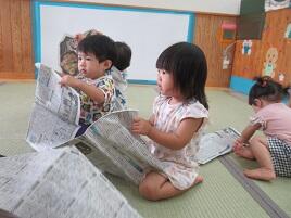 今日は、新聞紙であそびました。保育者がそばで紙を持ってビリビリ~すると一人ずつ新聞紙を持って引っ張ったり破ったり一緒に持ちながらビリッ。初めての遊びでしたが手先を使いながら上手でした。