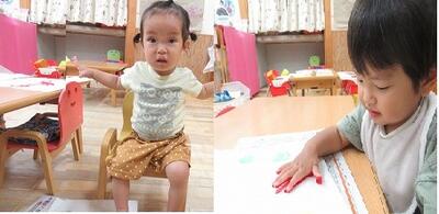 今日は室内で、提灯作りをしました。紙にスタンプ台や絵の具を付けて、手形や足型スタンプを楽しみました。筆で、手や足に色をつけていると、くすぐったいのか、身をよじる子ども達。でも、スタンプするときには、ダイナミックに押していました。たくさん押したくて、いつもより多めに手形を付ける子もいましたが、可愛い型がとれました。また、提灯にしたいと思います。