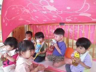 今日はとてもいいお天気だったので、交代で野球場迄歩いてお散歩しました。暑かったですが、風があり、気持ちがよかったです。子ども達も汗をかきながらも工事車両に喜んだり、サンサンバスが通りかかると手を振って見送ったりしました。野球場の木陰で水分補給をして、散策を楽しみました。帰り道に小学生のお兄さんお姉さん達と出会い、それぞれの兄弟と再会して喜んでました。