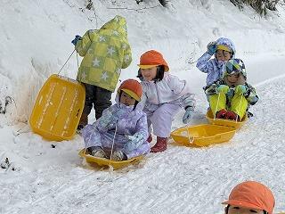 今日は、4・5歳児で津黒に出掛け、雪遊びをしました。いつもとは違う景色で、雪を見るだけでも「雪がめっちゃいっぱいある~」と、遊び始めからルンルン気分の子ども達でした。広場に着くと一面雪で真っ白~。足跡もなく、誰が一番先に足跡を付けるのか・・・。友達と恐る恐る雪の中へ入っていく子もいました。不安がありながらも雪の中に入ってみると、なんて楽しい♪雪の上を歩いたり、その場に寝転んでみたりとふかふかした雪の感触を味わいながら遊べたようでした。広場を出ると坂があり、その坂では、ソリ滑り♪保育園のくじら山と同じくらい⁉すいすい滑って楽しそうでした。帰りのバスの中では、「ソリ、楽しかったな」「雪の上に寝転んだのが楽しかったよな」など楽しかったことを友達や保育者にお話ししてくれる姿もありました。普段とは違う場所での雪遊びを思いきり楽しめたようです。
