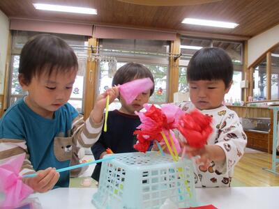 今日は、フラワー紙をくしゃくしゃにしてお花を作りました。「お花いかがですかー?」と保育者が声を掛けると集まってきた子ども達。「○○ちゃんもするー。」と一緒に紙をくしゃくしゃ。たくさんのお花ができました。「お花♡」と嬉しそうに持って遊んでいました。かごを出すとそこに次々とお花をたてて、アレジメントが始まりました。手にたくさん持って花束も‼最後は花を手にもってみんなでダンスをしましたよ。