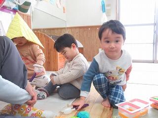 今日は今年の最後のオープンデーがありました。たくさんのお友だちが遊びに来てくれました。皆で節分に作った鬼のお面や帽子などを被って、歌を歌ったり、ダンスを披露しました。緊張しながらも、上手に表現してお友だちを楽しませてくれました。その後は、ホールでサーキット遊びをしました。オープンデーに来られたお友だちはステージの上で玩具で遊んだり、園児たちと交流を楽しみました。みんな小さなお友だちに興味津々で近づいて「こんにちわ~」と声を掛けて、目の前で玩具を鳴らしたり、布を振ってあげたり、楽しい時間を一緒に過ごしました。