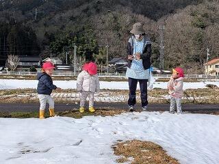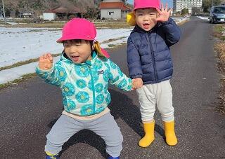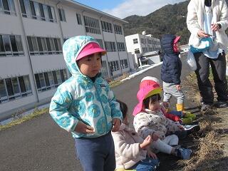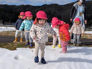 今日は小学校までお散歩に出かけました。雪が所々残っており、雪を踏みながら感触を楽しみました。降り始めの雪に比べて少し硬く、踏んでみると、サクっと音がしてそれが楽しい子ども達。小学校にはたくさんの雪が残っており、握って雪玉にして投げてみたり、雪が固まって小さな山になっている所を登って楽しみました。