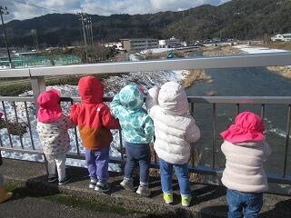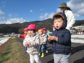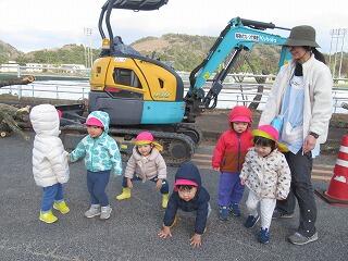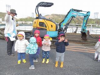 今日は水辺の楽校から野球場を通って小学校の前までお散歩しました。風は冷たかったですが、お天気が良く風にも負けず、たくさん散策を楽しみました。水辺の楽校までいくと、川側にショベルカーを見つけました。子ども達が「ショベルカーだ」と喜び、運転している人まで見えたのか、「おーい!おじいさーん!」と声を掛けていました。当然声は届かないのですが、「寝てるー」と子ども達。「動いているから寝てないよ」と答えると、また、「おーい」と呼びかけていました。、水辺から眺め、野球場からも呼びかけ、給食センター近くでも眺めて堪能するまで見学してました。