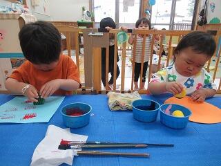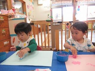 「ポンポン♪」「ぽぽぽぽぽ!」と言いながらスタンプ遊びをしました。同じ場所にスタンプする子や満遍なく押す子など様々な花の模様ができました。