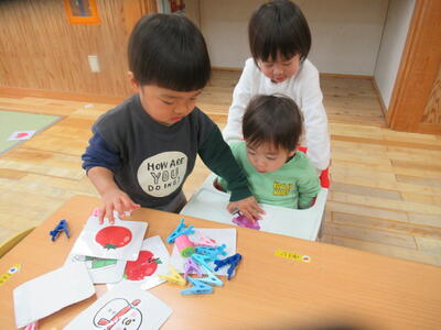 今日は、洗濯ばさみを使ってあそびました。何回か遊んできましたが、少しずつカードを挟むことができるまで、こつをつかみ、指の力がついてきたことを感じました。カードをナイロンテープにつるして、今度はお買い物ごっこ開始!!保育者の「いらっしゃいませ~」の声掛けに「これ!ちょうだい!」と上手に言葉やジェスチャーで返してくれる子どもたちでした。