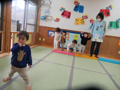 今日は、おひな様製作2日目!!終わってから、みんなでダンスを何曲も踊って体を動かしました。保育者が船やバスになって満員の膝の上でした。晴れないかな~と外を眺めたりした、1日でした。