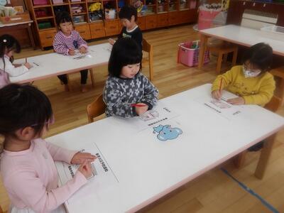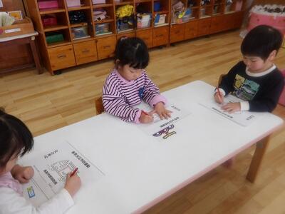 廊下にお雛様が飾られ、みんなでお雛様鑑賞をしました。ひし餅があるね、これはお団子かな、可愛い顔だねと各クラスのお雛様を見ていました。自分のお雛様をみつけると、「あ、これ僕のだ。」「わたしのもあったー」と嬉しそうでしたよ。その後は2月の月刊絵本でシール遊びや塗り絵をしました。友達と絵本をつなげて、会話も弾んでいました。