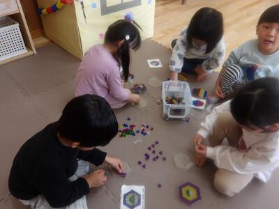 今日もお雛様製作は続きます。順番を待っている間、今日はいつもとは違う玩具で遊んでみました。ストローをつなげて釣り竿をつくり魚釣りを楽しむグループ、小さい三角を組み合わせてキレイな形をつくっていくグループ。それぞれ好きな遊びを楽しんでいましたが、長い時間遊び続けていました。みんなの集中力すごいです!!