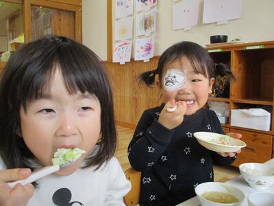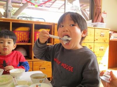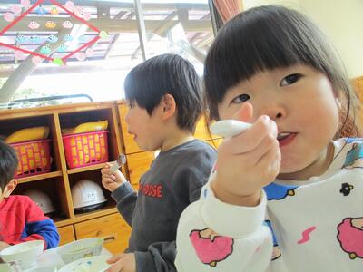 みんな大好き給食タイム!「あーんって大きいお口で食べてなー」と言うと、みんながこれでもかってくらい大きなあーんで食べてくれました♪