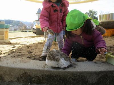 砂場でままごとが始まり、「パスタつくってるの」「大根とたまごでおでん作る」「雪に砂かけたら黄粉もちだよ」とすごく具体的な言葉が出てきて、もう以上児さんで大丈夫だな!って思わせてくれました(笑)