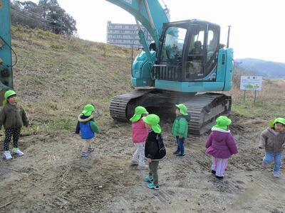 道中で無人のパワーショベルも発見し、至近距離で「うわーでっかー!」と隅々まで観察するもも組さんでした。