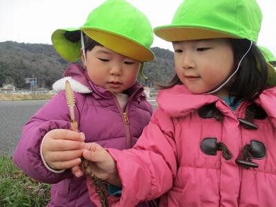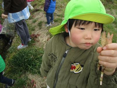 三朝と倉吉の境目あたりまで散策にいってみると、どんぐりやカマキリの卵、藤の花の種などを発見し、大事そうに保育園まで持ち帰っていましたよ!