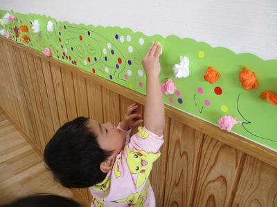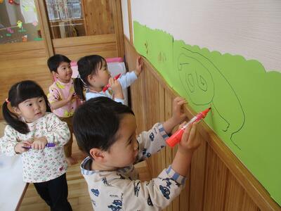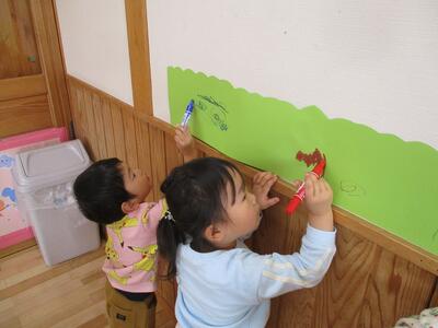 壁にカキカキしたりお花やシールを貼って春らしい壁面が完成しましたよ♪