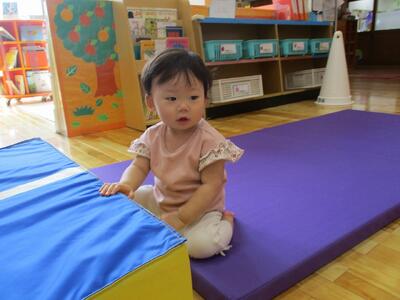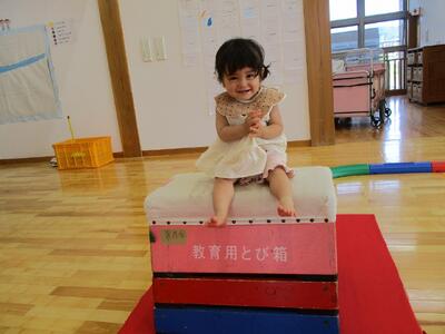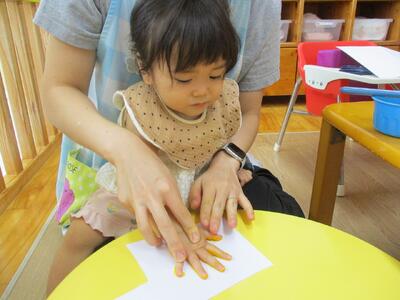 今日は、9月の製作で手形を取りました!手形を取ることに慣れてきて、上手に手をパーにしてくれる子ども達。絵の具の感触を嫌がる子もいましたが、自分の番が来ると嬉しそうに駆け寄ってきてくれました。製作後は、たんぽぽ組さんが遊んでいたサーキットで少し遊ばせてもらいました。跳び箱やデコボコブロックなど嬉しそうに触れて体を動かしていました!