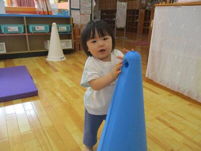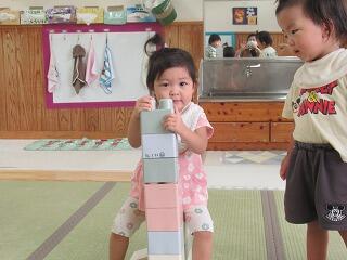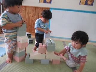 今日は大きなブロックを使って遊びました。はじめは高く積み上げて楽しんでいましたが、だんだんと組み合わせ方を変えて、階段のようにして登ろうとしてみたり、椅子のようにして座って楽しんでいた子ども達。どうしても乗ってみたい気持ちが強く、乗り物を作って乗って楽しみました。