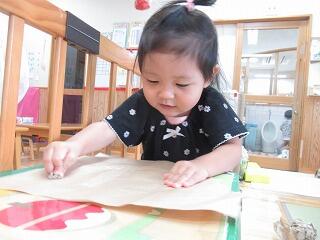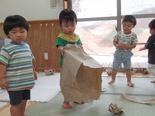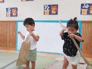 今日は大きな紙を使って遊びました。びりびり破ってみたり、長い紙をもって引きずって歩いてみたり、ちぎった紙をおにぎりのように丸めてみたり、丸めた紙をボールのように投げて楽しみました。中には、紙を紙で硯のように擦ってまるで職人さんのように真剣に擦ってました。使い終わったら、みんな袋に集めてお部屋がきれいになりました。丸めた紙はまた、何に変身するかな?お楽しみです♪