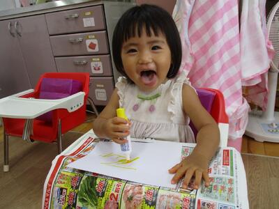 今日は、9月の製作で画用紙にお絵描きをしました。いろんな色を使ってぬりぬりすることを楽しむいちごぐみさん。ペンのキャップを自分で外そうとしたり、「あれがいい!」と違う色を指差したりしていました。何に変身するかはお楽しみです!