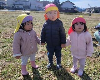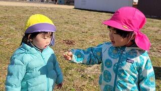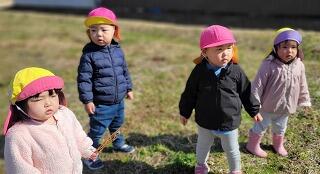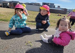 今日は農道までお散歩に行きました。とてもいいお天気でどこまでも歩いて行けそうなみかん組さん。野原でいちご組さんが散策していたので、一緒に散策を楽しみました。一つ年上のみかん組さん、手を繋いで一緒に散策を楽しんだり、草むらの中から何かないか一緒にのぞき込んだりしながら自然探索を楽しみました。