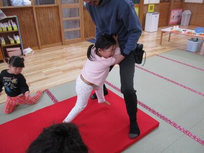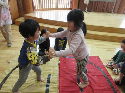 せっかくなのでお部屋に帰ってからもも組相撲大会を開き、保育者と全力で闘ってもらいました(笑)見学の成果が出て、もも組さんも見様見真似で、「のこったのこった~」と相撲を楽しんでくれました♪
