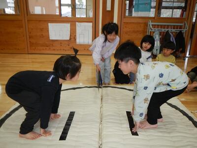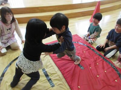 以上児クラスで相撲大会が開かれたので見学に行ってきました。お兄さんやお姉さんがはっけよーいしてるのを見て、もも組さんも興味津々でしたよ♪