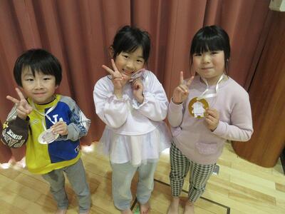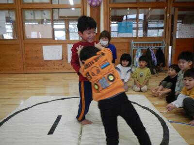 なかよし活動で「相撲大会」をしました。相撲のルールのお話を聞いてから、赤白黄チームに分かれて予選会がスタート。行司役のさくらぐみさんに名前を呼ばれると、恥ずかしそうにしながら土俵入り。「はっけよい、のこった!!」の合図で各チームとも白熱した取り組みが行われていましたよ。各チームの予選1位の子で決勝リーグを行い、ちゅうりっぷ組・たんぽぽ組・さくら組の1位2位3位が決まりました。勝って喜び、負けて悔しがり涙が出てしまう子もいましたが、応援するみんなの姿も素晴らしく、みんなに応援頑張ったで賞をあげたいくらいでした。