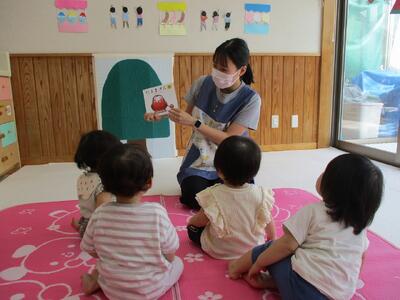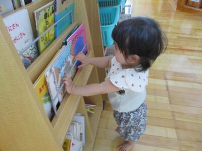 いちご組さんでは、今週から朝の会を始めました!ゴザを敷くとみんなが集まって、絵本や歌、お返事などを楽しんでいます。朝の会後は、ギャラリーで絵本タイムを楽しみました。気になる絵本を持って「これ!」と保育者に渡したり、ソファに座ってゆっくり読んだりする子ども達でした。