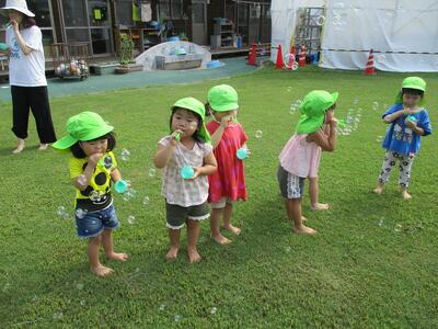 みんなで一斉に「フー!」とすると、きれいにシャボン玉が舞い上がり、みんなニコニコになっていましたよ♪