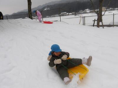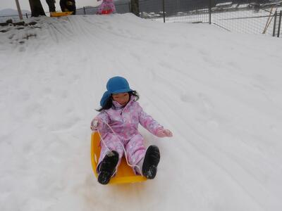 ちょっと怖かったソリ遊びにも慣れ、一人でもスイーっと上手に滑れるようになりましたよ♪