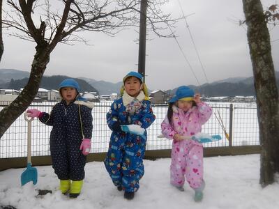 今日も雪が積もっていたので、園庭に出て雪遊びをしました。今日は、くじら山ではなく、小さく積もった雪の山からそり遊びを楽しみました。小さい山でしたが、スリルがあって楽しそうでした。しばらくすると、雨が降ってきましたが、少しだけ雪遊びを楽しむことができました。