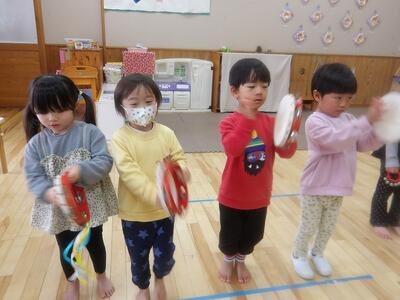 三回目の楽器遊び。今日はやりたい楽器を決めてから合奏をしてみました。一番はタンバリン、二番は鈴、三番はカスタネット、自分の楽器でないときは大きな声で歌ってみようと、合奏をしてみると初めてなのにとっても上手にできてびっくりしました。生活発表会でさくらさんがする合奏に憧れていたちゅうりっぷさん。さくらさんみたいにかっこよかったよ!!