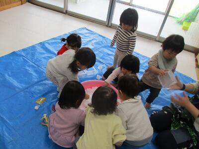 今日は、保育室でブルーシートを敷いて雪遊びをしました。タライに雪を入れるとみんなが集まって容器やスコップ、手で雪に触れる子ども達。つららを取るとぎゅーっと握って持ち歩いたり、ペンのように持って雪を混ぜ混ぜしたり・・・冷たさを気にせず夢中になって遊びこんでいました。