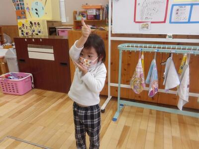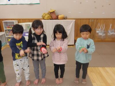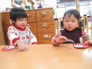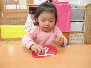 今日はお部屋で製作をしました。先日手形でだるまを作ったものに、丸シールで目玉を作りました。それぞれ目玉が上に向いたり、下の方に向いたり、真ん中に寄ってみたり、様々な表情のだるまができました。お部屋に飾りたいと思います。