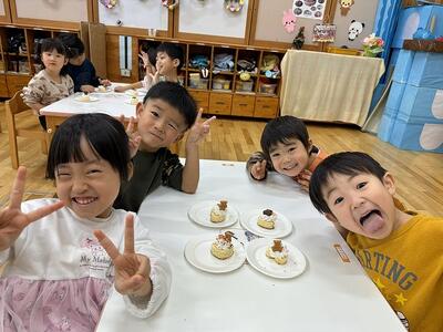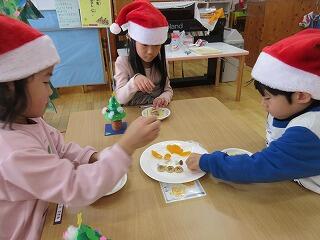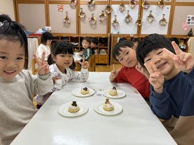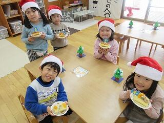 今日は、1日遅れてのクリスマス会をしました。クリスマス会に向けて、巨大クリスマスツリーや飾りを作って準備してきていたので、今日を楽しみにしていた、さくらさんです。司会進行も子ども達にお任せ。まずは、クリスマスビンゴゲームとクリスマスクイズ大会をしました。クリスマスクイズ大会は、チーム対抗だったのですが、チームの友達と一緒に答えを考え、チームワーク抜群‼クリスマスの歌もルンルン気分で歌ってくれました。ルンルン気分のまま、クリスマスケーキ作り☆スポンジの歌に生クリームやチョコ、クッキーを飾り、美味しそうなケーキが完成‼給食の後のデザートで食べました。「おいし~」と自分の作ったケーキに満足♡2日連続でクリスマス気分を味わった子ども達です。今年も今日で終わり。明日からは、長いお休みに入ります。皆さん、よいお年をお迎えくださいね。