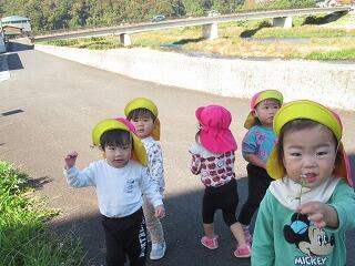 さくら組ちゅうりっぷ組で散歩に出かけました。歩きながらたくさん実っている柿をみつけて「オレンジになったね」「早く取らないとクマに食べられちゃう」と話したり、工事中のショベルカーをかっこいい!!と一緒に眺めたりと、すっかり仲良しです。ちゅうりっぷさんはさくらさんの真似をしたくていつもなら怖くて出来ない石段を登ることができたり、さくらさんはそんなちゅうりっぷさんの姿を優しく見守り、時に助けてくれたりと、見ていてとっても微笑ましいですよ♡散歩が終わってお部屋に戻る時がいつも名残惜しい子ども達です。