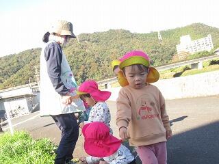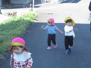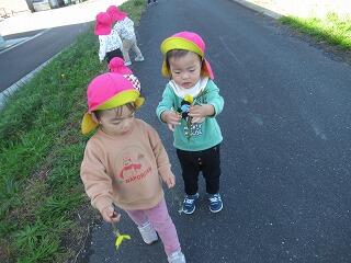 今日は、いい天気だったので農道に散歩へ行きました。お名前を呼ぶと「はい!」と返事をして、一人一人帽子をもらって外へ行く準備をします。まだ上手には被れないですが、嬉しそうに頭の上に乗せたり、窓の方へ集まったりする子ども達でした。自分で草花を取ったり、虫を触ろうとしたり色々なものに興味を持って楽しんでいました。