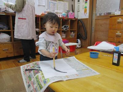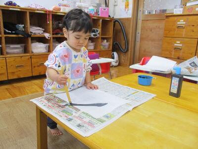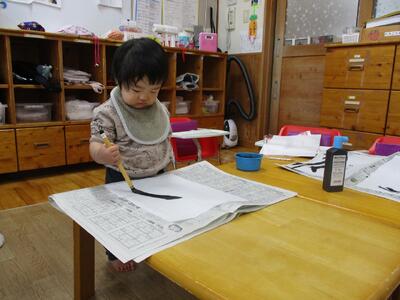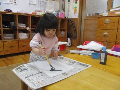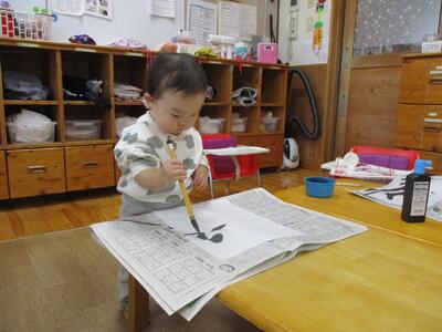 今日は、書初めをしました!初めて筆を持ってみましたが、少し緊張しながら持つ姿や「はやくやりたい!」とやる気満々の姿が見られました。持ち方がとても上手でびっくりしました!絵の具で塗る時とは、少し違って縦横、斜めなどに1本ずつ線を描いたり、点を描いたりする子ども達でした。