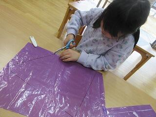 今日は凧作りを製作しました。ナイロン袋にマジックで絵をかいて、紐をつけて廊下でたこあげを楽しみました。ナイロン袋で作った凧がふわっと上がり、喜ぶ子ども達。何度も廊下を行ったり来たりしながらたこあげを楽しみました。