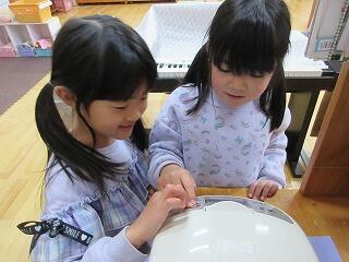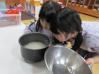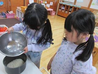 今日は、2人で過ごしたさくらさん・・・。凧作りでは、カラーポリを切って作りました。初めて切ったようで、「何?これ?なかなか切れんだけど~」と少し苦戦気味でしたが、上手くハサミを動かして切れると「やっと切れた~」と。凧に好きな絵を描いたり、カラーポリを好きな長さに切ったりして完成させました。英会話教室まで時間があったので、米とぎに挑戦。米とぎに慣れている子ども達なので、保育者が何を言わなくても、自分たちでとぎ、最後は、メモリを見ながら少しずつ水も入れて炊飯しましたよ。「あとちょっと。はいもういいよ」と2人で協力しながら水を入れる姿、可愛かったです♡外にも出れなかったので、ゆったりと過ごした1日でした。