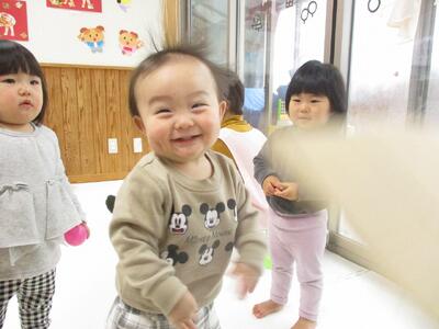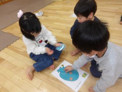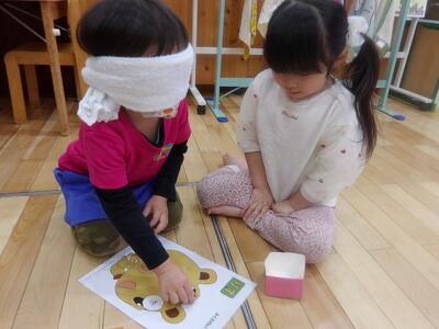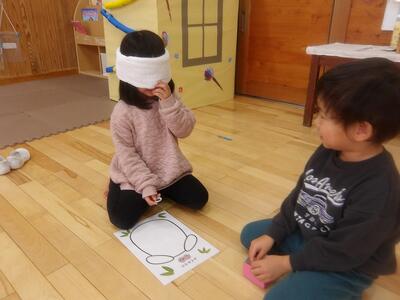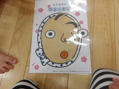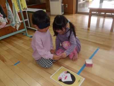 昨日のなかよし活動で福笑いの面白さを知ってしまったちゅうりっぷさん。今日はお部屋で福笑いをして楽しみました。お部屋のあちこちから「なにこれ~(爆笑)」「おもしろ~い(爆笑)」と大笑いする声が聞かれました。でも笑い声の中にも「ちょっとお顔からはみ出してるよ」「目が反対だよ」など友達に優しく教えてあげる姿もあり、みんなで仲良く遊べました。その後お手玉で遊んでいると、部屋の前を通りかかった園長先生に「お手玉、三つでしてみてください」と難しいお願いをするちゅうりっぷさんでした。