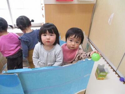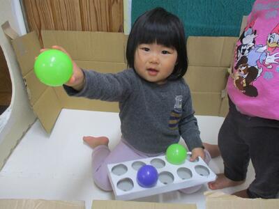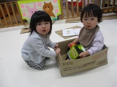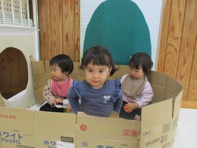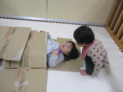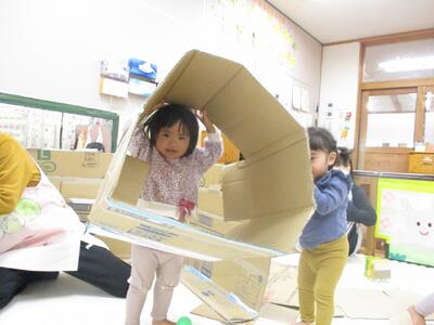 今日は、ダンボール遊びをしました。お菓子の箱を持ってその中にボールを入れたり、ダンボールをお家のようにしたり、トンネル、車のようにしたり、色々な遊び方を楽しみました。友達がやっていると自分もやりたくて「変わって!」「入れて!」とアピールする子ども達でした。