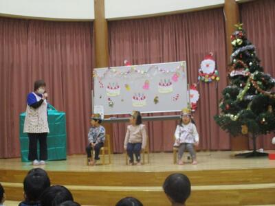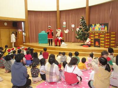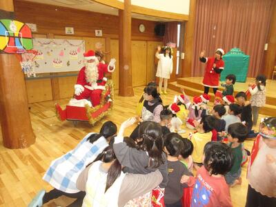 今日は、子どもたちが待ちに待ったクリスマス会!12月の誕生日会が終わると、どこからか「シャンシャンシャンシャン♬」鈴の音が!!静かになったホールにそりに乗ったサンタクロースが「メリークリスマス!!」とやって来てくれました。「さんたさん!さんたさん!」と名前を呼ぶ大きい組さんと「うわ~ん💦」と怖くて泣いてしまう小さい組さんの大合唱となりました。サンタさんの好きな食べ物や生まれた場所を質問したりして優しいサンタさんのことをたくさん知ることが出来ました。おまちかねのプレゼント!とっても素敵な時間となりました。「毎日元気で笑顔でいてください」という暖かいメッセージをもらいみんながにっこりしたのでした!また来年も来てもらうことを約束してサンタさんとお別れしました。「サンタさんありがと~!」