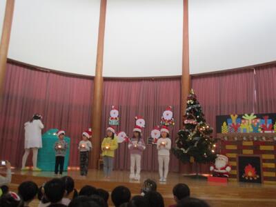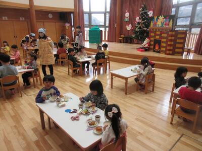 今日は、1日遅れてのクリスマス会をしました。クリスマス会に向けて、巨大クリスマスツリーや飾りを作って準備してきていたので、今日を楽しみにしていた、さくらさんです。司会進行も子ども達にお任せ。まずは、クリスマスビンゴゲームとクリスマスクイズ大会をしました。クリスマスクイズ大会は、チーム対抗だったのですが、チームの友達と一緒に答えを考え、チームワーク抜群‼クリスマスの歌もルンルン気分で歌ってくれました。ルンルン気分のまま、クリスマスケーキ作り☆スポンジの歌に生クリームやチョコ、クッキーを飾り、美味しそうなケーキが完成‼給食の後のデザートで食べました。「おいし~」と自分の作ったケーキに満足♡2日連続でクリスマス気分を味わった子ども達です。今年も今日で終わり。明日からは、長いお休みに入ります。皆さん、よいお年をお迎えくださいね。