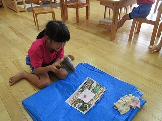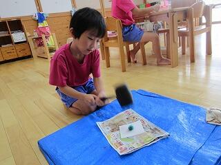 ハロウィン製作の続きをしました。今日は、モンスター作りで、デコレーションボールに絵の具を付けてハンマーで叩きました。「えっ?もう叩いていい?」「えっ?いいか?」と叩くことにドキドキな子ども達でした。デコレーションボールを叩くと、モンスターのような形になり、「モンスターになった~‼」と‼そして叩いた瞬間、絵の具が飛び散り、「ここにもとんだ~」「顔にも付いた~」と友達と一緒に顔を合わせて大笑い‼鏡を見ながら、絵の具を落としていました(笑)絵の具が乾いたら、目などを付けてモンスターに変身させます‼かぼちゃの色付けもしました。完成までもう少しです。
